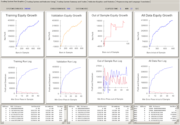 For the past 20 years mathematicians and software developers have searched indicators and patterns in stock and commodity markets looking for information that may point to the direction of the market. This information may be used to enhance the performance of Trading Systems. Generally this discovery process is accomplished through a combination of trial and error and more sophisticated "Data Mining". Typically, the developer will take weeks or months of number crunching in order to produce a potential Trading System. Many times this Trading System will not perform well when actually used in the future due to what is called "curve fitting". Over the years there have been many Trading Systems (and Trading System development companies) that have come and gone as their systems have failed in live trading. Developing Trading Systems that continue to perform into the future is difficult, but not impossible to accomplish, although no ethical developer or money manager will give an unconditional guarantee that any Trading System, or for that matter any stock, bond or mutual fund, will continue to produce profits into the future forever. What took weeks or months for the Trading System developer to produce in the past may now be produced in minutes through the use of Trading System Lab. Trading System Lab is a platform for the automatic generation of Trading Systems and Trading Indicators. TSL makes use of a high speed Genetic Programming Engine and will produce Trading Systems at a rate of over 16 million system-bars per second based on 56 inputs. Note that only a few inputs will actually be used or necessary resulting in generally simple evolved strategy structures. With approximately 40,000 to 200,000 systems needed for a convergence, time to convergence for any data set can be approximated. Note that we are not simply running a brute force optimization of existing indicators looking for optimum parameters from which to use in an already structured Trading System. The Trading System Generator begins at a zero point origin making no assumptions about the movement of the market in the future and then "evolves" Trading Systems at a very high rate combining information present in the market and formulating new filters, functions, conditions and relationships as it progresses towards a "genetically engineered" Trading System. The result is that an excellent Trading System may be generated in a few minutes on 20-30 years of daily market data on virtually any market.